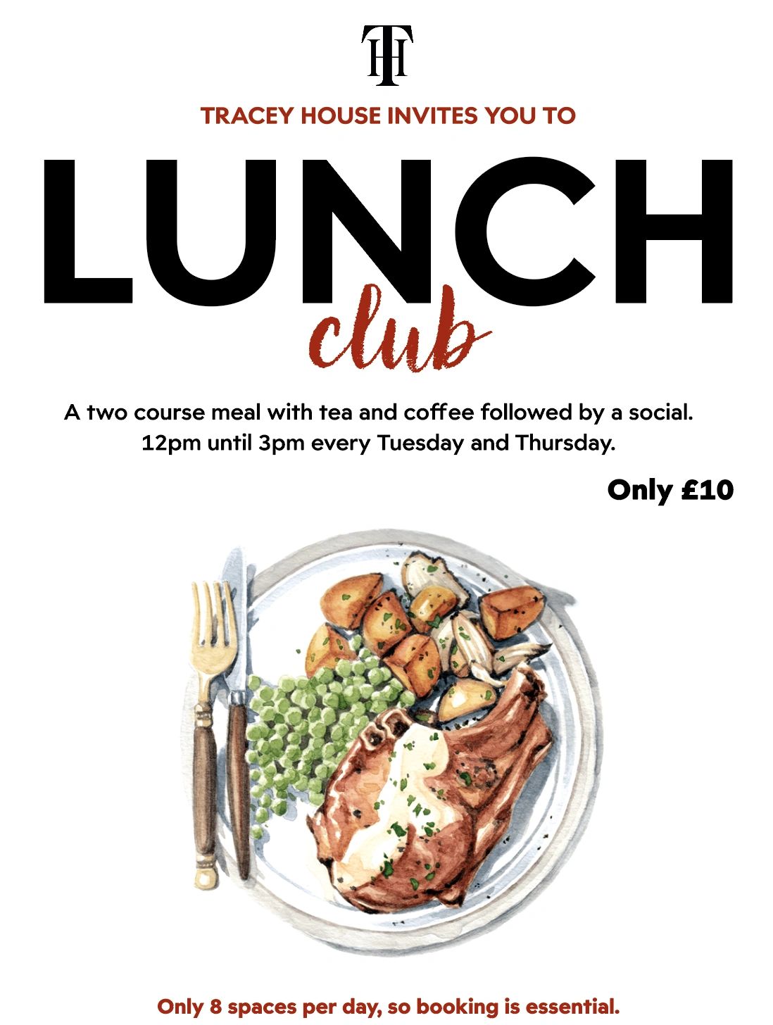 Tracey House Lunch Club is every Tuesday and Thursday between 12:00 and 3:00, where you can come along and enjoy a two-course meal with tea and coffee, followed by social activities in the afternoon.